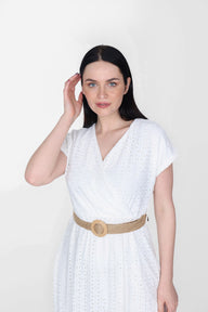 Dazzle in white with this exquisite dress featuring a waist belt, enhancing your elegance and beauty.