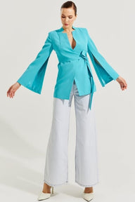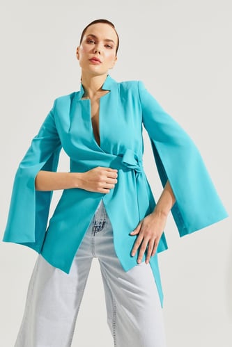 Our Open Long Sleeve Jacket with Detailed Tie is a versatile piece that transcends simple categorization. It's equally suitable for formal business environments when paired with tailored trousers or a pencil skirt, and for casual chic outings when combined with jeans or a relaxed dress.