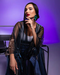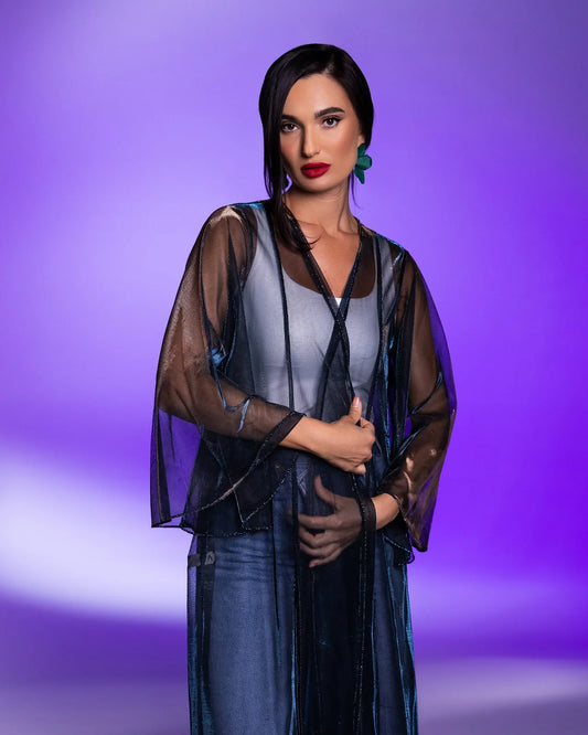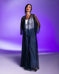 Turn heads with the Flowing Blue abaya—designed to dazzle with delicate shimmering lines. This piece strikes the perfect balance between bold modernity and timeless elegance, ideal for those who love a touch of sparkle in their everyday wardrobe or evening outings.